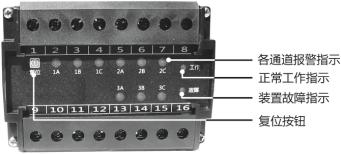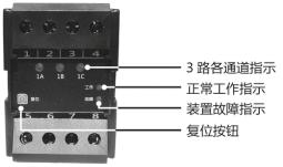 面板內(nèi)容 含義 1A、1B、1C 2A、2B、2C 3A、3B、3C 檢測(cè)各路運(yùn)行狀態(tài),當(dāng)任何一路保護(hù)時(shí),故障燈點(diǎn)亮。 工作 裝置正常運(yùn)行時(shí),每秒種閃爍一次 故障 裝置本身故障時(shí)點(diǎn)亮 復(fù)位 當(dāng)某路發(fā)生故障時(shí),在排除故障后按此鍵裝置恢復(fù)正常